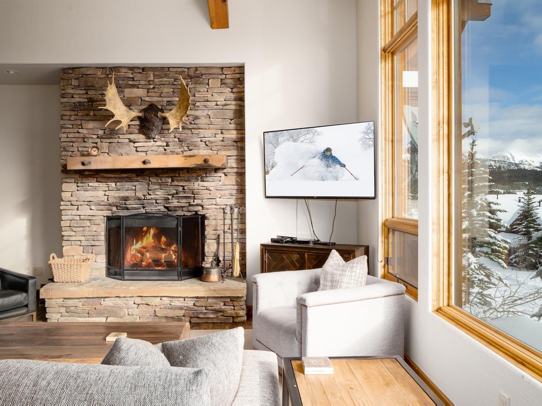 Awe-inspiring mountain views, a grand vaulted ceiling, and alpine accent pieces set the scene inside this 2-story condo’s cozy great room, located on the second floor. Sink back into the plush sofa as the wood-burning fireplace crackles. With a 55” Smart TV, Blu-ray player, Wii console, and a Roku, there are multiple entertainment options for unwinding off the trails. The rustic kitchen’s open layout lets the chef of the group stay a part of the action and boasts stone countertops, high-end appliances, and inviting rustic touches. Whether settling in for a home-cooked meal or a family game night, the wood dining table has plenty of seating—4 chairs and a long bench. The island offers an additional 4 seats. Delight in unfettered mountain views from the covered back deck with a grill and 2 Adirondack chairs. When it’s time to retire for the evening, retreat to the primary bedroom with a stone fireplace, king bed, and deck entry.