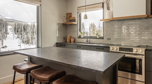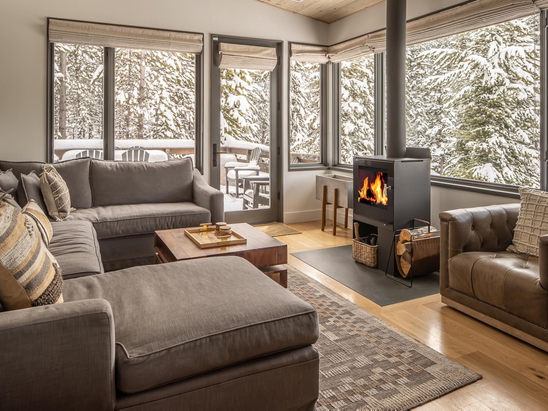 Modern design pairs with mountain aesthetics inside this cozy 3-level retreat. The main level hosts a combined living, dining, and kitchen space decorated with atmospheric grays and warm leather and wood accents. A contemporary wood stove sits between the plush sectional couch and large armchair, inviting guests to kick back with an evening cocktail and appreciate the view of snow-frosted evergreens out the picture windows. A wooden dining table for 6 separates the living space from the kitchen, equipped with high-end appliances and an island seating 3. Step onto the deck for alfresco dining at the picnic table on bluebird days.