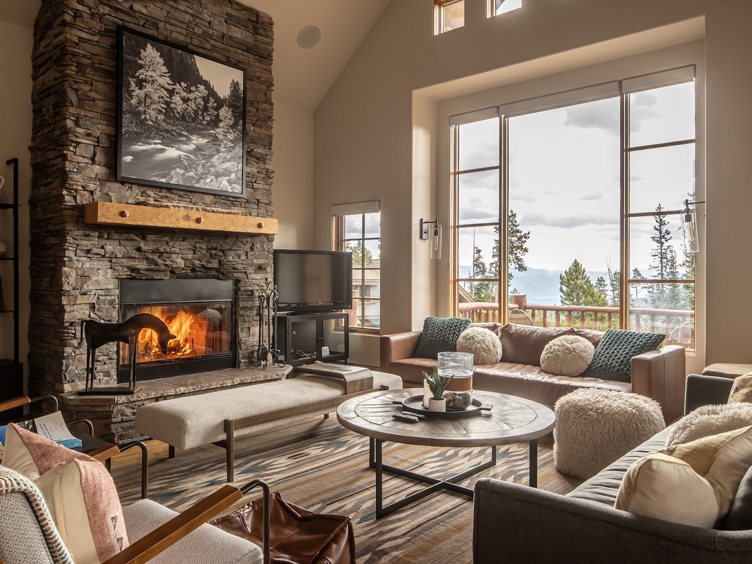 A bench, hooks, and boot warmers at the entry offer a convenient spot to remove outdoor gear. Continue into the open great room, where wide windows frame sweeping mountain views. The floor-to-ceiling fireplace, flanked by a mix of stylish furniture, tempts guests to gather with cocoa and wine for a cozy evening of conversation or watching TV. Savor a morning coffee at the 2-person dinette set tucked into the windowed corner. Enjoy a meal or a lively card game at the round dining table for 8. Additional seating for 3 is at the breakfast bar in the open kitchen—equipped with high-end appliances and everything guests need to prepare fueling feasts for adventurous days. Step onto the expansive wraparound deck to find a grill and the private hot tub, where guests can soothe sore muscles while enjoying the seclusion and beauty of towering pines. The primary bedroom is on this floor and features a king bed, gas fireplace, balcony, and a private bathroom.