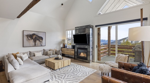 Take the stairs to the main level, featuring a Scandinavian-styled great room designed with rough-hewn log accents providing a rustic touch. To one side is the sunlit dining space and kitchen, which boasts a Viking oven, Subzero refrigerator, and waterfall countertops alongside a walk-in pantry—perfect for stocking snacks, groceries, and wine. As the chef of the group sears and sautés, guests can chat and sip cocktails at the 3-seat breakfast bar that doubles as an island before meandering over to the 8-seat dining table for dinner. In the living area, a plush sectional sofa and leather club chairs surround the cozy fireplace and TV. Open the sliding glass door to grill or enjoy après-ski drinks at the bar-height table—all while enjoying the majestic mountain view.