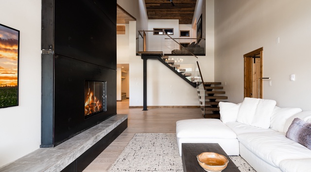 Contemporary décor pairs with natural materials and a relaxing palette of brown, cream, and white inside this 2-story condo. South-facing windows illuminate the main level with spectacular natural lighting as guests enter. A plush sectional and dramatic black fireplace sits against the stunning backdrop of mountain views to create a comfy mountain escape. The fully equipped kitchen was designed for entertaining family and friends with high-end appliances and a bar-height counter with 3 stools. Play a mix of favorite tunes on the Sonos speakers while eating home-cooked meals, playing games, and telling stories at the 8-seat dining table. Afterward, take a drink to either of the 2 balconies and enjoy the breathtaking views. Retire to the primary bedroom with a king bed—early risers will appreciate the sunroom and armchair for enjoying the view of Lone Peak and Lake Levinsky. The guest bedroom on this floor has a king bed and Smart TV.