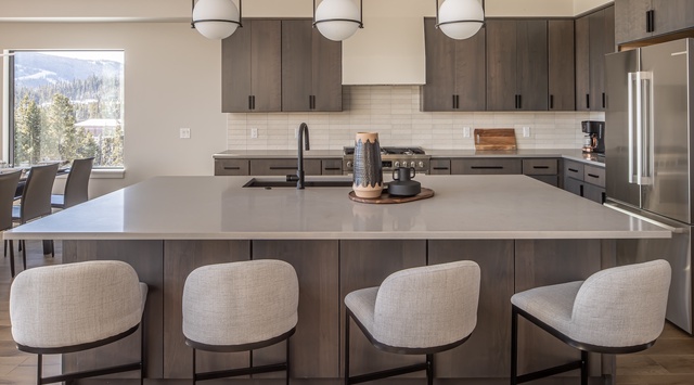 Guests enter this 3-story home onto the second-floor where the great room’s muted color palette and elegant furnishing create a seamless, soothing space. The plush sectional beckons for guests to indulge in a quiet evening watching TV while the wood-burning fireplace crackles. In the kitchen, discover top-end appliances and an open floor-plan so guests can stay connected to all the action as they cook. The expansive island doubles as a breakfast bar for 4, and there’s room for 10 at the dining table. Relish in the unobstructed, sweeping mountain views on the back deck—the ultimate spot to sip a morning cup of coffee. A mudroom with cubbies offers convenient storage for skis and Winter gear, and the laundry room makes it easy to travel light! The primary bedroom is on this level with a king bed and private bathroom.