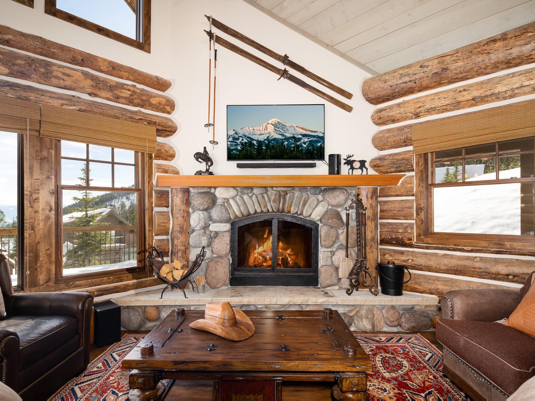 This retreat merges rustic Western décor with modern comforts on the main floor, featuring a wraparound deck with uninterrupted views of Lone Peak and surrounding ranges. The spacious, open-concept layout includes a charming wood-burning fireplace and an expansive wall of windows overlooking the mountains for a traditional ski lodge atmosphere. In the living area, a full-length leather sofa and armchair face the 55” TV with a SONOS sound system for cozy evenings at home. Steps away, a gourmet kitchen invites home-cooked meals with granite countertops and high-end appliances. Surrounded by windows, the 8-person dining table provides dinner with a view, plus 2 additional seats at the breakfast bar. Step outside onto the sweeping deck to fire up the Weber gas grill for BBQ around the 6-seat alfresco dining table, or simply enjoy panoramic views from the 2 Adirondack chairs. Two family-friendly bunk rooms on this floor provide versatility, with 1 twin-over-queen bed in each room.