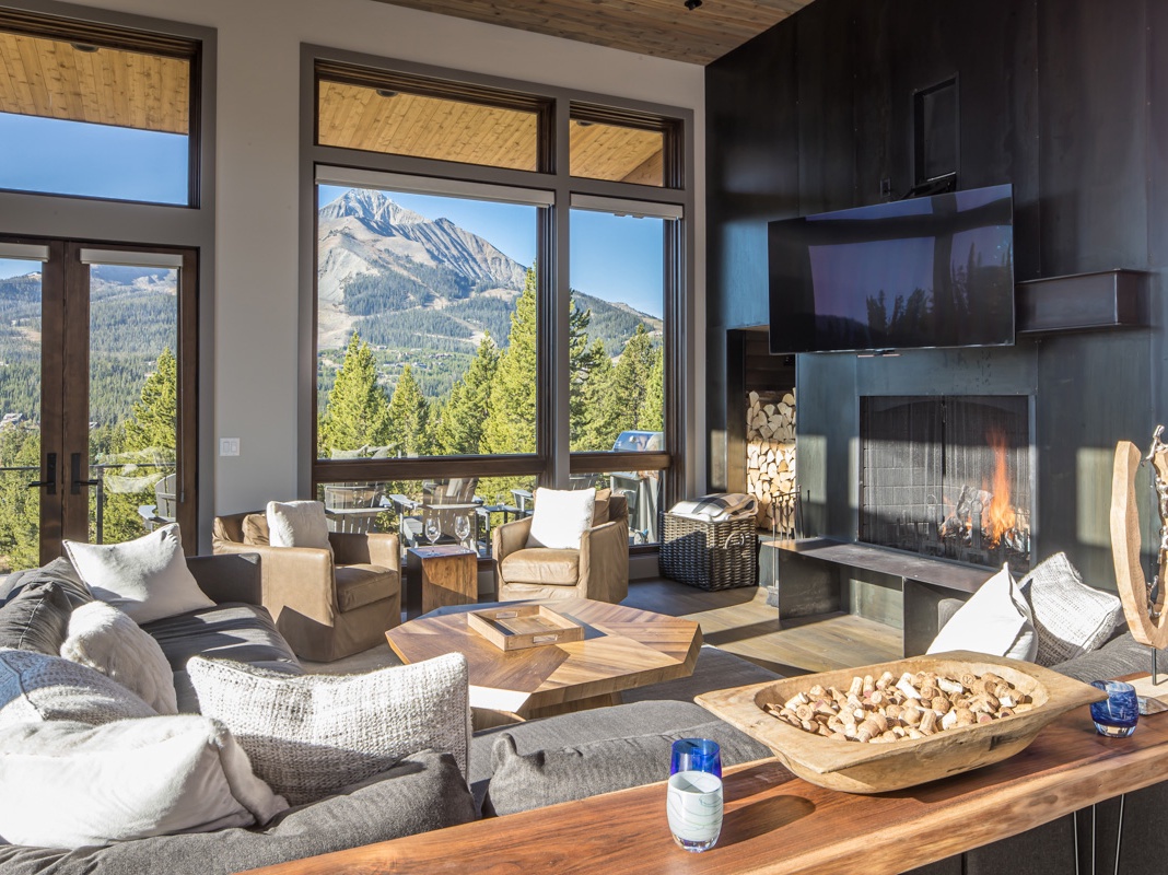 The entrance to this 3-story home reveals a modern mountain aesthetic, marked by a delightful mix of natural colors and textures. The living area, beautifully centered around a wood-burning fireplace, showcases high-end furnishings, tall ceilings, and walls of floor-to-ceiling windows that frame uninterrupted views of the Gallatin Range, Andesite Mountain, and the iconic Lone Peak. Equipped with premium Thermador appliances, the sleek chef's kitchen is perfect for preparing everything from a hearty breakfast before hitting the slopes to a special dinner crafted by a private chef. A gas grill with Adirondack seating is conveniently located on the side deck for grilling out. Snowcapped mountains and dense forests provide a scenic backdrop while eating at the distinctive blue resin dining table that seats 8, with 4 more seats at the breakfast bar. Outdoor enthusiasts will appreciate the large mud/ski room with benches and hooks to hang wet ski or fishing gear and a home weather station to track fresh powder. A gorgeous primary bedroom on this floor provides a royal sanctuary with a room-sized shower in the private bath.