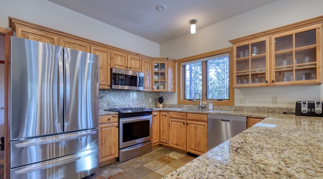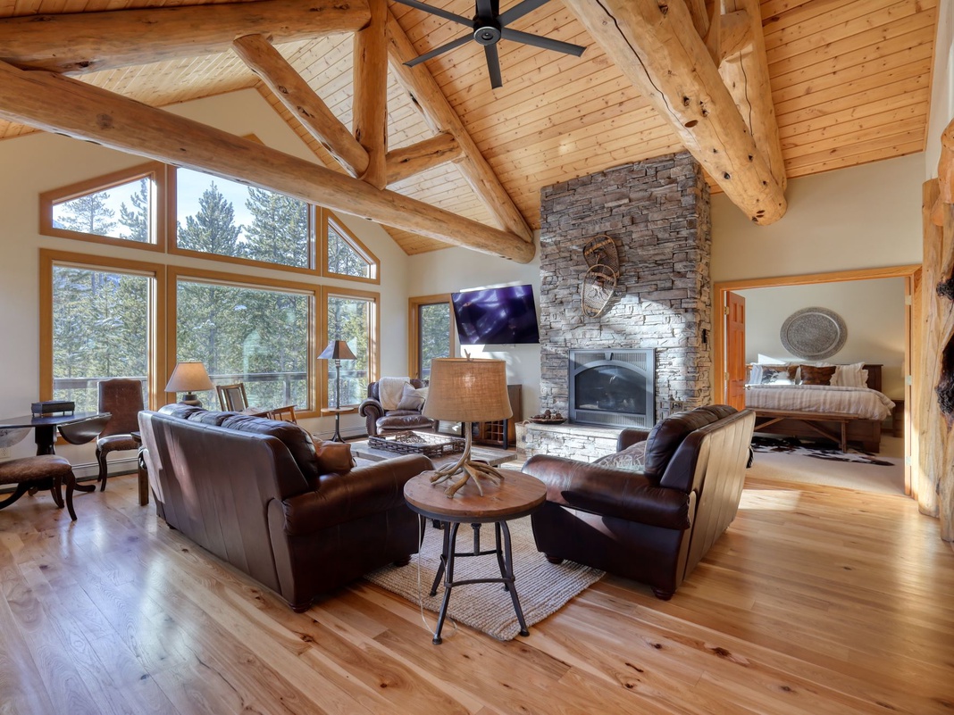 Sunlight beams through the soaring picture windows, highlighting the cathedral ceiling and exposed log trusses in the main level great room as guests enter. After a day of exploring the mountain, sink into the leather sofas in front of the stacked-stone fireplace and warm up by the flickering flames. Cooking is a delightful venture with high-end appliances, stone tile floors, and a picturesque view in the kitchen. Cubbies and hooks in the adjacent laundry room offer convenient storage for Winter gear. The traditional wood dining table seats 8, with 3 more seats at the bar. Out the sliding glass door, find a grill and revel in a tranquil soak in the private hot tub overlooking the snow-capped mountain. When it’s time to retire for the night, the primary bedroom is on this floor and has a king bed, private bathroom, and balcony access.