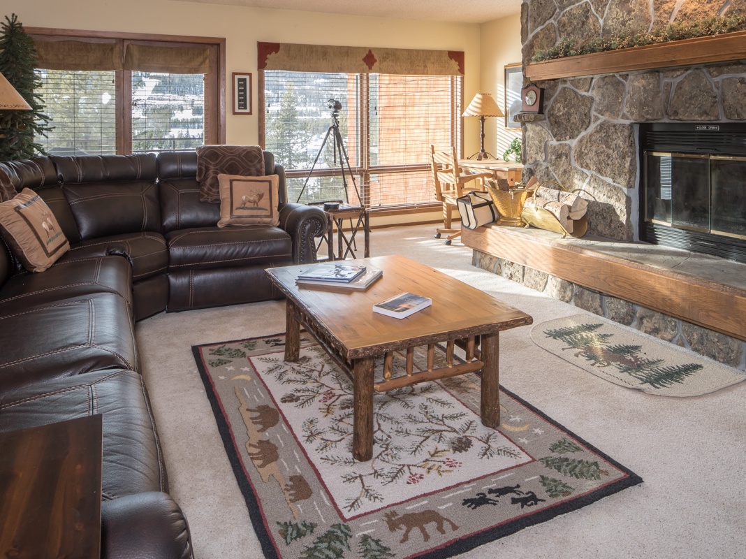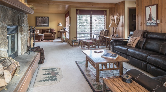 A quintessential mountain retreat featuring rustic, Montana-inspired décor and a sunny, open-concept living area invites guests into this single-story condo. Expansive windows cast a warm glow over the great room while offering gorgeous views of the Montana wilderness. Curl up by the woodburning fireplace or unwind on the leather sectional in front of the 65” TV. Log accent furniture and vintage ski décor create an alpine lodge ambiance in the primary living space. An adjacent reading chair and ottoman beckon for a best-selling novel while the other sitting area sleeps 2 more on a queen sleeper sofa. Gather around the 6-person dining room table after a day on the mountain or sit at the 4-stool breakfast bar to fuel up for the day. The bright, open kitchen is complemented by high-end Kenmore appliances for easy meal prep. The primary bedroom, also accessible from a private entrance on the balcony, boasts a king bed and private bathroom. An equally inviting guest bedroom features a queen bed and shared hallway bathroom. The fully furnished, private balcony is perfect for après ski drinks on bluebird days or early-morning coffee.