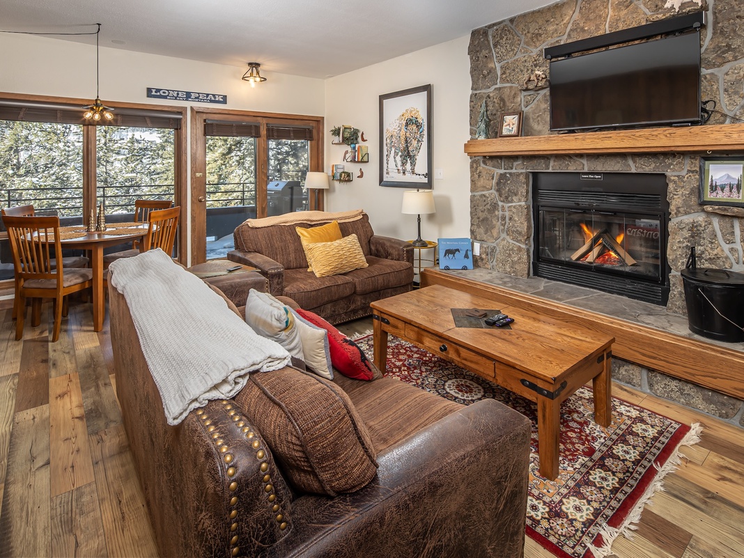 Get ready for the ultimate mountain retreat at this fantastic first-floor condo in Big Sky! The fully equipped kitchen makes cooking a breeze with plenty of counter space for meal prep, a double basin sink for easy clean up, and a 3-stool breakfast for casual dining. The living area is perfect for relaxing after a day of adventure. Curl up next to the beautiful woodburning fireplace on the comfortable couch and loveseat with front-row seats for a movie night at home on the Smart TV. The convenient queen sleeper sofa in the living area is ideal for groups of three or more. Natural light fills the room from the doors leading out onto the covered deck. Step out and take in the incredible views of Lone Peak with loved ones! The deck even has a romantic firepit area with seating, perfect for cozy nights under the stars. For added convenience, there’s an outdoor grill. The primary bedroom is a dream come true, with a king bed—plus a day bed with a trundle—and a TV for additional entertainment.