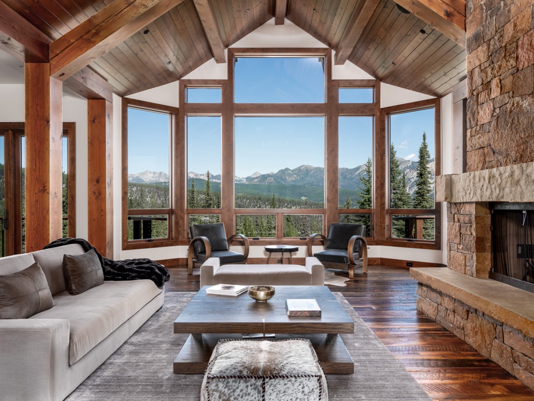 Styled in mountain modern decor with hardwood floors throughout, this chalet features a living room with high ceilings, a floor-to-ceiling stone fireplace, and full-story picture windows revealing breathtaking views of the Spanish Peak mountains.
