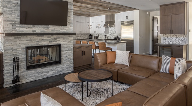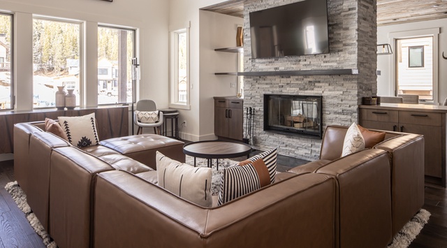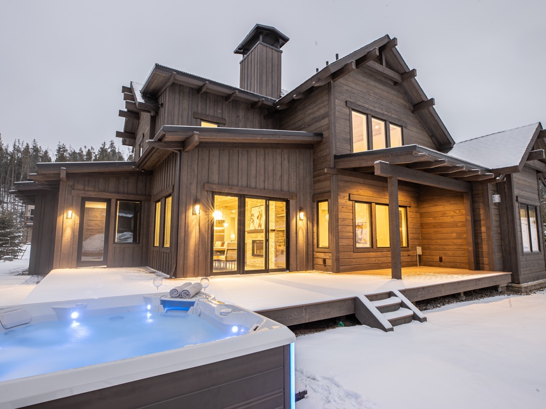 Surrounded by towering pines, this contemporary 2-story home welcomes guests back from the slopes with a well-appointed ski room featuring lockers and a bench. The great room’s rustic tongue-and-groove ceiling and an open-concept living area invite cozy gatherings after a day on the mountain. Stretch out on the wraparound sofa to watch a movie on the Samsung TV, or curl up by the double-sided fireplace—separating the living space from the dining area. Up to 10 guests can enjoy a meal at the formal dining table, with room for 4 more guests at the breakfast bar. In the gourmet kitchen, Sub-Zero and Wolf appliances inspire guests’ inner chef or prepare an après BBQ on the expansive deck on bluebird days. Indulge in an evening cocktail in the private hot tub while overlooking the mountains. When the day ends, retire to the primary bedroom with a king bed, private bathroom, and TV.