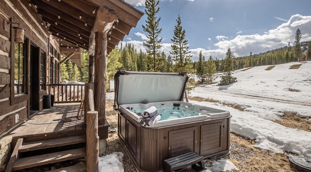 Nestled among the snow-frosted evergreens, this cabin-style home opens into a spacious entry with hooks and a bench for removing boots and outerwear. Head into the combined kitchen, living, and dining space, where windows frame the forested views and a vaulted tongue-and-groove ceiling accentuates the rustic atmosphere. Curl up with cocoa on the soft sofa and armchairs situated around the stacked-stone fireplace and 55” TV for a cozy movie night. High-end appliances and lots of counter space in the kitchen make it easy to create a gourmet meal to share. The live-edge dining table has room for 8, and there are 4 additional seats at the bar. The primary bedroom offers a restful spot to retire with a king bed, 40” TV, private deck, gas fireplace, and a private bathroom. There is also a guest bedroom with a queen bed. Sip a cocktail on the back porch and enjoy the Montana air. On the side of the home is the private hot tub.