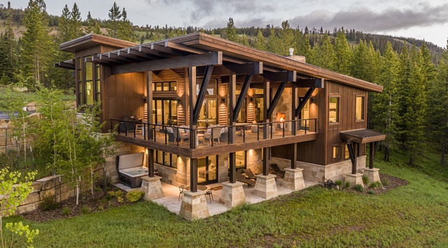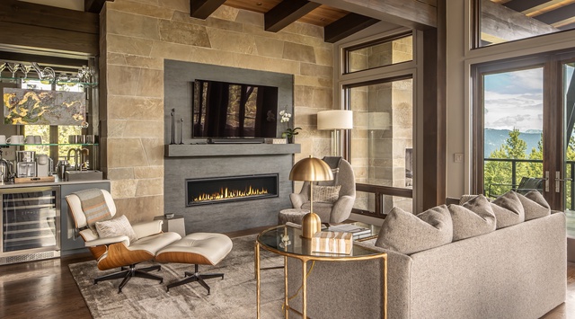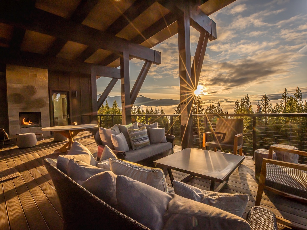 Sleek, contemporary style merges with rustic warmth and natural materials in the main level of this 2-story home. Step into the great room to find hefty wood beams, stylish light fixtures, and expansive windows framing nature and ridgeline views. The living space encourages cozy nights spent sipping cocoa and mixed drinks by the fireplace, with a soft couch, 2 accent chairs, and a nearby wet bar. The kitchen is well-designed for gourmet cooking with sleek countertops, a Wolf range, and a 3-stool breakfast bar that offers clear views of the living area and a round dining table for 6. Warm weather and bluebird days invite guests onto the vast deck—sip wine by the outdoor fireplace or relax with friends and family in the sitting area. When the evening winds down, retire to the peaceful primary bedroom boasting a king bed, a private bathroom, a gas fireplace, and deck access.