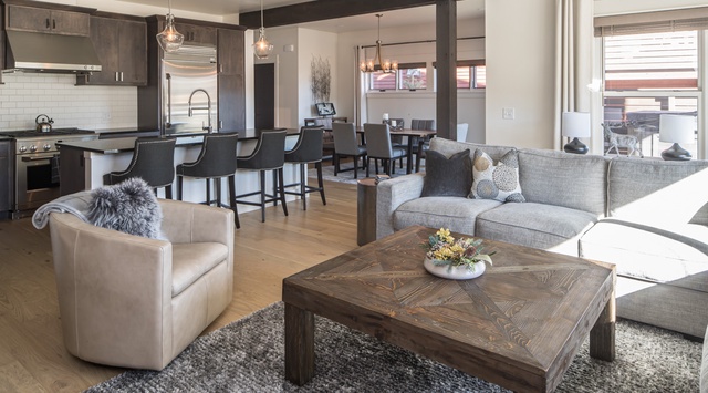 Styled with elegant décor, this 2-story townhome welcomes guests inside with new furnishings and rough-sawn hardwood accents. A sunlit great room with soaring ceilings, hardwood floors, and a cozy gas fireplace invites guests to unwind. Settle in on the comfy sectional and leather club chair while a movie plays on the 50” TV and Sonos sound system. Enjoy snacks prepared in the gourmet kitchen with high-end Monogram appliances, including a gas range and all the necessities for a home-cooked meal. A formal dining table seats 6, while the breakfast bar seats 4 more. The great room extends to a lovely fenced-in patio, where guests can fire up the gas grill on bluebird days or unwind in the 8-person hot tub after a day on the slopes. A charming café table for 2 provides the perfect setting for alpine sunrises and sunsets. The mudroom is conveniently located near the garage, with cabinets, hooks, and a bench for easy ski and hiking gear storage.