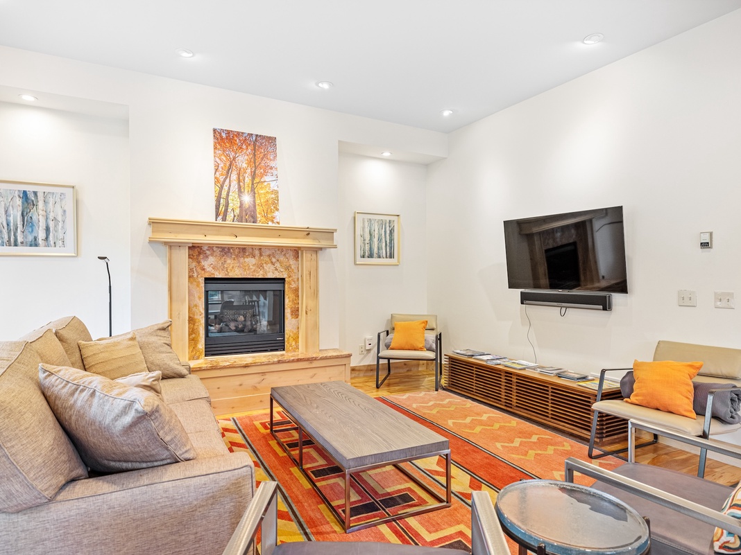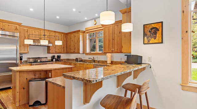 Designed with outdoor lovers in mind, this spacious property welcomes guests with a large ski/mudroom equipped with built-in cubbies, lockers, and hooks. Slip off Winter coats, hiking boots, and other adventuring gear before entering the inviting great room. Honey-wood trimmed windows and hardwood floors add cottage-inspired charm to the modern furnishings and finishes. Picture relaxed mornings cooking pancakes in the chef’s kitchen, featuring high-end appliances, a center island, and a breakfast bar for 2. In the corner, a round 6-seat table awaits hearty meals and heartfelt conversations—or whip out a deck of cards and it becomes the perfect game table! The living area is a few steps away, making it easy to mingle between spaces. Settle onto the sofa and armchairs for a casual movie night on the Smart TV with a timeless gas fireplace adding warmth and a gentle glow. Out the back door, a patio with a gas grill and table invites alfresco dining or sink into the private hot tub for a rejuvenating soak. A convenient desk space and laundry room complete the floor.
