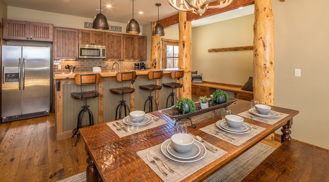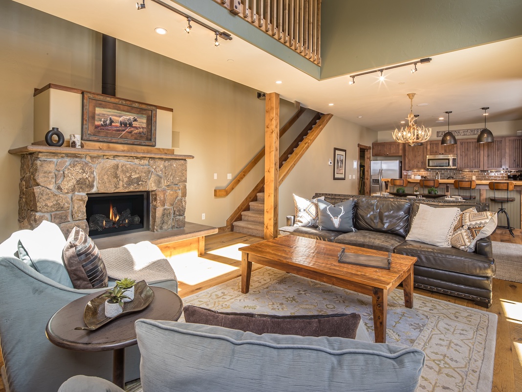 Hewn-timber posts, hardwood floors, and a flagstone fireplace curate a warm and comfortable environment in the first-floor great room of this chic mountain home. By the front door, find hooks and a convenient bench for slipping off outerwear. To the side is a beautiful open-concept kitchen with high-end appliances and a 4-stool breakfast bar for enjoying a morning caffeine boost or an après-ski glass of wine. An 8-person table sits beneath an elegant antler chandelier and divides the kitchen from the living area. Lounge on the sofa and 2 armchairs while watching TV or swapping stories of the day’s adventures. Out the glass doors, discover an enclosed patio, and spend the evening rejuvenating sore muscles in the private hot tub or indulging in a nightcap at the 4-seat table. A bedroom with a queen bed and private bathroom on the first-floor also accesses the patio through your own private entry.