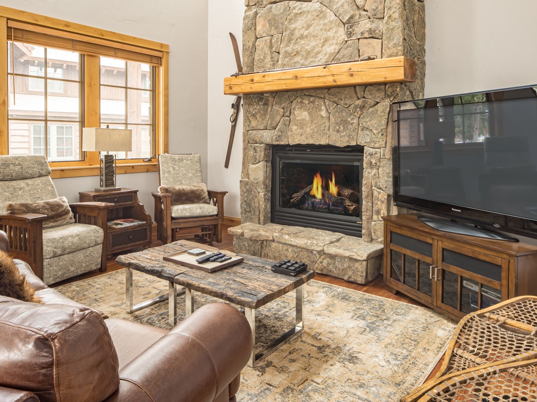 Nestled on a quiet street with a covered front porch overlooking the mountains, this spacious townhouse welcomes guests to an open-concept living area with high ceilings, big picture windows, and alpine chalet decor—including vintage skis and log furniture. In the sitting area, a wraparound leather sofa and 2 country armchairs frame a soaring stone fireplace and TV for cozy nights inside after a day on the mountain. Steps away, high-end appliances and a gas range in the kitchen make it simple to prepare a delicious meal for 4 to share in the light-filled dining area, with 3 extra spots at the bar. Feel free to pack light and take advantage of the convenient laundry room. As the day ends, the primary bedroom with a king bed provides a tranquil spot for rest.