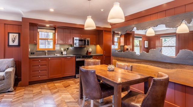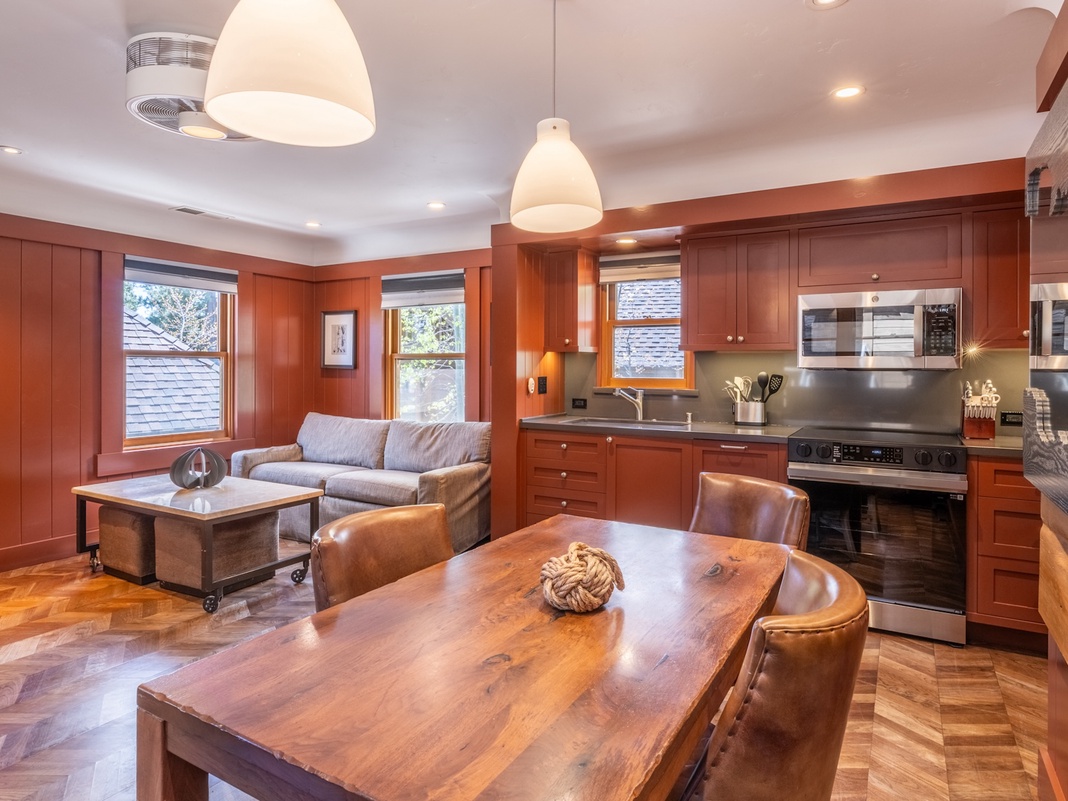 On the upper level, stunning chevron parquet floors stretch throughout the living space, dining area, and kitchen. Settle onto the soft loveseat for a night of streaming movies on the TV. When it’s time to refuel, guests will find everything they need for preparing meals in the kitchen, including high-end appliances and a wooden dining table that seats 4.