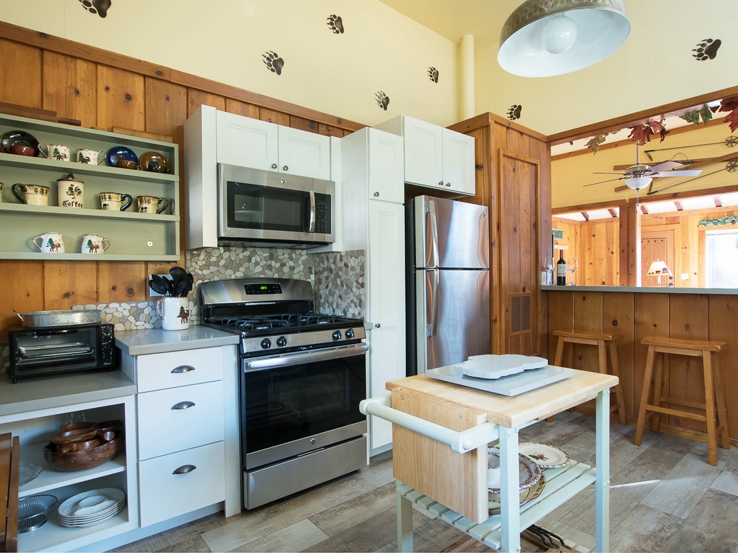 This 3 bedroom home sleeps up to 8 guests. The primary bedroom has a king sized bed, the 2nd bedroom has a queen size bed and the third has a queen and a bunk bed. The large, newly renovated kitchen with stainless steel appliances opens off the living room where you can keep cozy by the gas fireplace. A true cabin at the lake vacation experience, this home features unique touches throughout, like stenciled accents on the wall.