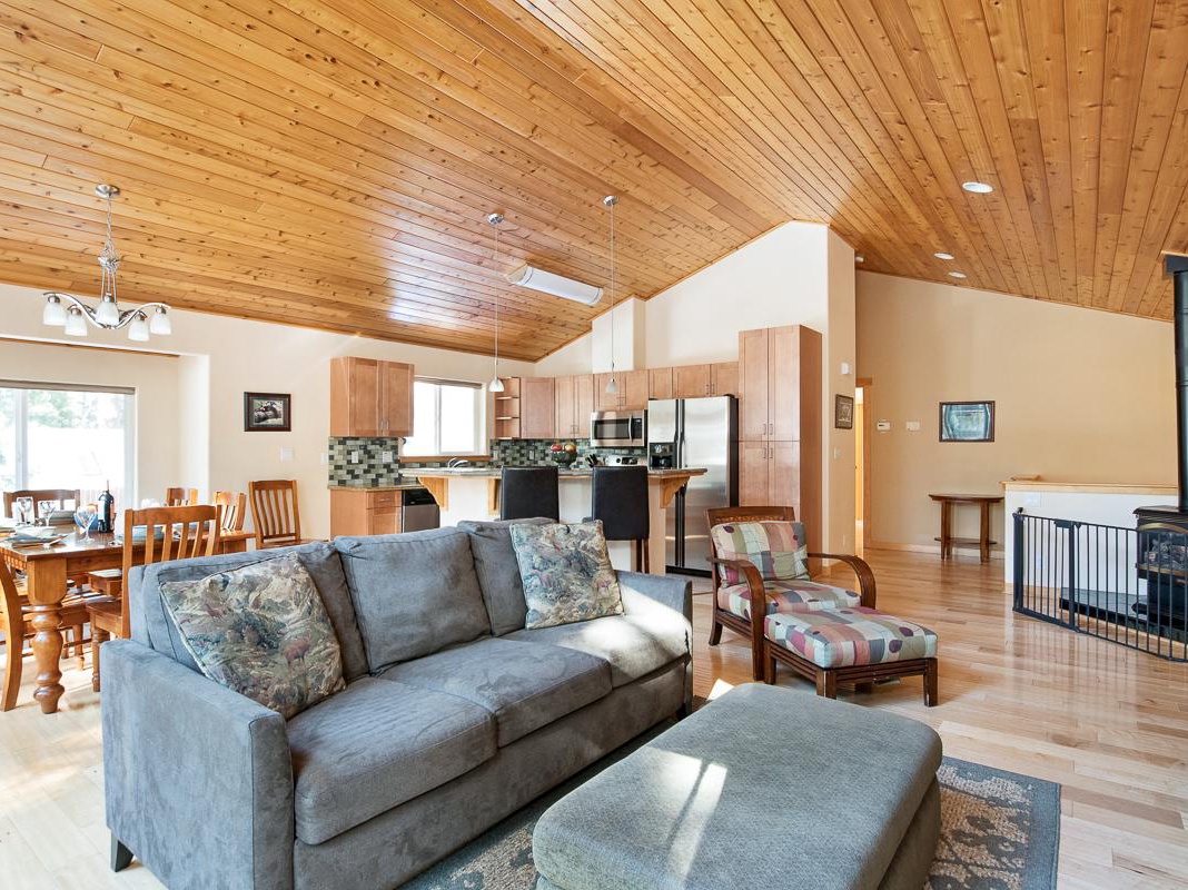 On the main level, a golden tongue-and-groove wood ceiling stretches above the open great room, accented by sunlight from the picture and clerestory windows. In the corner, a gas stove fireplace offers warmth on snowy Winter nights. The kitchen features Kenmore appliances and a breakfast bar for entertaining friends or prepping meals while keeping an eye on little ones. Up to 8 can share meals at the dining table, and in the Summer months guests can dine alfresco at the balcony table for 4. When it’s time to unwind, slip outside to relax in the patio hot tub or settle into the living area’s soft couch and chaise armchair to watch a movie on the Roku TV. The primary bedroom is on this floor and boasts a king bed, private bathroom, TV, and a private balcony.