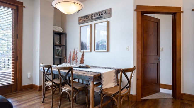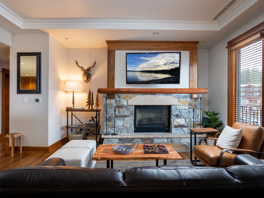 Discover a modern mountain retreat made of gleaming wood accents and a gorgeous fireplace with a rough-hewn stone façade inside this open-concept condo. Guests enter into a tiled entry with a hall tree for storing ski coats and hiking boots. In the living area, floor-to-ceiling windows let in natural light and provide views of the peaceful setting. Settle on the leather sofa and club chair to relax by the gas fireplace or enjoy the Smart TV. For remote work, there’s a charming antique writer’s desk in the corner. The spacious kitchen is fully equipped and boasts granite countertops. Seat up to 6 guests at the hardwood dining table, with 3 stools at the breakfast bar for extra seating or a designated kid’s table! The furnished balcony is an ideal spot for unwinding with a nightcap while taking in the crisp alpine air. When bedtime arrives, retire to the primary bedroom, which hosts a soft king bed, TV, and shared bathroom. Additionally, there is a guest bedroom with a queen bed and a charming bunk room with a twin-over-twin bunk and twin trundle—both feature TVs. A stackable washer and dryer make it easy to keep ski gear toasty and lake clothes dry.