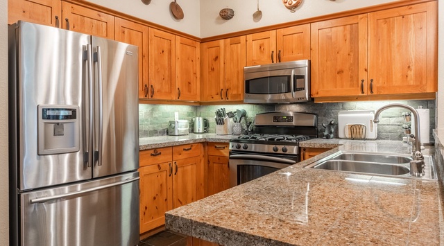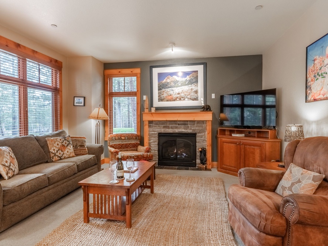 A classic log cabin façade hints at the coziness and charm inside this ground-floor, end-unit condo. A convenient hall tree and bench for offloading boots and outdoor gear greets guests in the entry. Down the hall is the combined kitchen, dining, and living space, filled with natural light and homey décor for a warm and inviting atmosphere. In the comfortable living area, plush furnishings and a gas-burning fireplace create the ultimate space for relaxing with friends or watching the 55” TV. The chef of the group will appreciate the high-end appliances and open layout of the kitchen. Enjoy delicious meals with loved ones in the dining area, which seats 6 under a stunning antler chandelier. For outdoor lovers, the shady patio has a 2-person cafe set, a Weber 2-burner gas grill, and views of the wooded grounds. After a fun-filled day, retire to the 2 inviting bedrooms. The primary bedroom boasts a queen bed, Smart TV, and a private bathroom, while the guest bedroom is perfect for kids or young adults with 2 twin beds. A queen sleeper sofa in the living area offers sleeping accommodations for extra guests. Feel free to pack light thanks to the stacked washer and dryer hidden in the hallway closet.