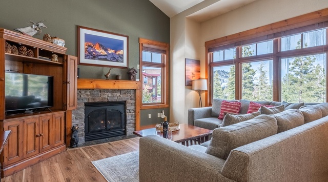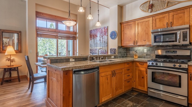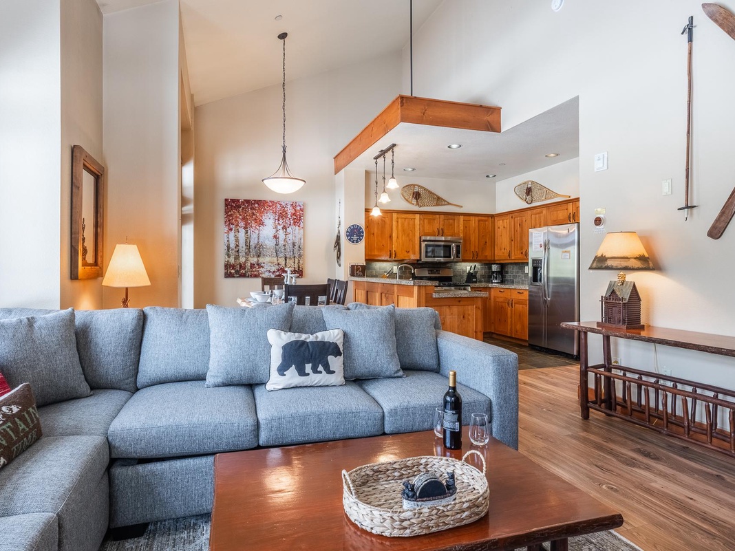 Inviting mountain-themed décor beautifully accentuates the warm wood flooring and vaulted ceiling to create a laid-back retreat. Savor the warmth of the cozy gas fireplace and settle into the plush sectional with a comforting cup of cocoa for a family movie night. Whether whipping up a relaxing mid-day brunch or a fueling feast, the modern kitchen is well-equipped with high-end appliances and gleaming granite counters. The live edge wood dining table has plenty of seating—4 chairs and a bench—for the group to enjoy a delicious meal or a board game. On the balcony, bask in the serene view of majestic evergreens dotting the mountainous landscape. When it’s time to retire for the evening, choose between 2 guest bedrooms—1 has a queen bed and the other has 2 twin beds. A queen sleeper sofa in the living space offers additional accommodations for last-minute guests!