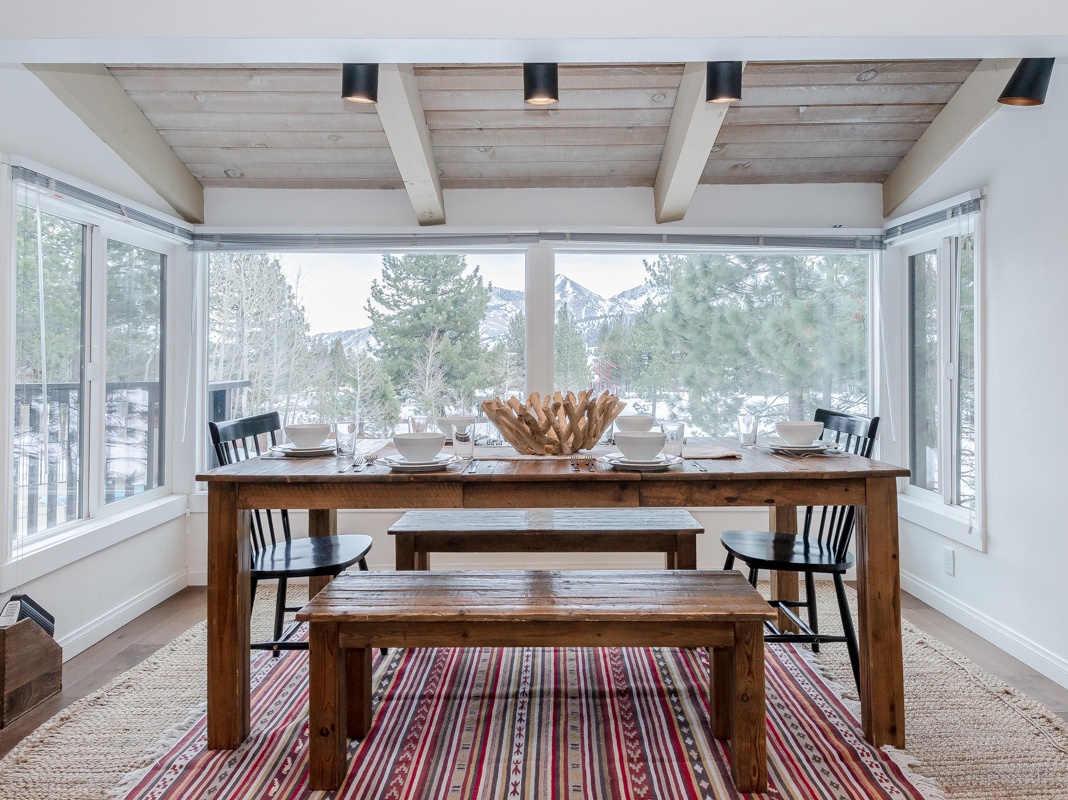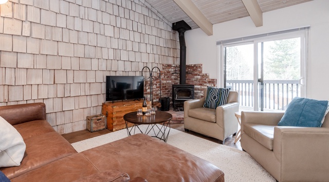 The main floor of this condo features an open floor plan, vaulted ceilings, and oversized picture windows, creating a modern, yet rustic ambiance. After a day on the slopes, relax on the soft sofa and stylish club chairs and stream a favorite movie on the Smart TV as the wood stove warms the space. Blue-bird and Summer days beckon guests out the sliding glass doors onto the private deck with a BBQ grill and mountain views. Steps from the living area, an 8-seat dining table with bench seating sits in a windowed nook with views of the peaks and evergreens. To the side is a spacious kitchen, fully equipped with high-end appliances and a Nespresso machine for fueling early risers catching first tracks. A guest bedroom with a queen bed is on this level, or guests can venture downstairs for additional sleeping accommodations. A laundry closet by the front door offers convenience for extended stays.