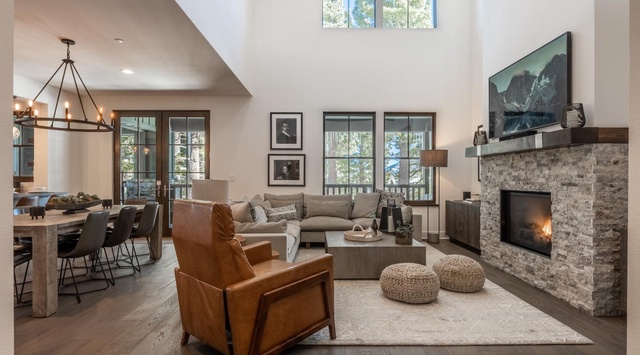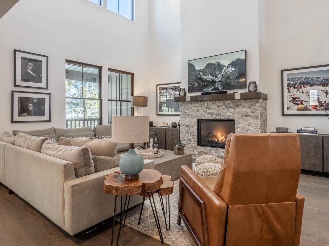 Hardwood beams, cast-iron accents, and Old Hollywood-era photos offer a classic ski lodge feel inside this 3-level retreat. After a day on the mountain, curl up in the 2-story living space, where a wraparound sofa and vintage leather armchair frame a cozy stone fireplace and mounted TV, for a restful evening of cocktails and cocoa by the fire. A formal 8-seat dining area sets the scene for sharing delicious, home-cooked meals prepared in the gourmet kitchen, featuring top-of-the-line appliances, a chef’s layout, and a 4-stool breakfast bar. Through the French doors awaits a spacious private deck with outdoor lounge furniture, a barbecue grill, firepit, and mountain views. This level also hosts a washer and dryer to ensure gear is ready for the next day’s adventures.