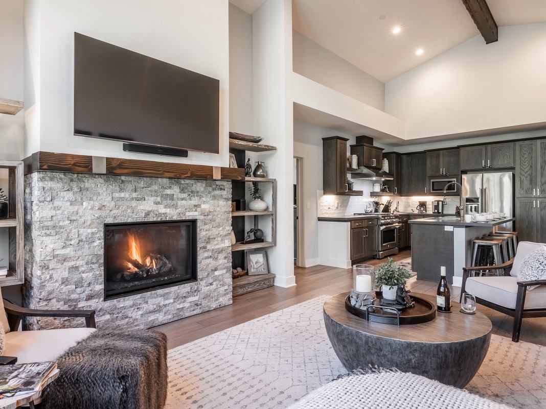 A tiled entryway with a convenient bench welcomes guests to this lovely home. Head into the open-concept great room, adorned with hardwood floors, soaring ceilings, numerous windows, and a stone fireplace surrounded by plush contemporary furnishings. The gourmet kitchen features high-end appliances and an open layout designed for simultaneous cooking and entertaining. Gather at the 4-stool breakfast bar for lazy mornings, sipping coffee and planning activities. Steps away, a formal dining nook hosts an 8-seat table and French doors leading out to the covered deck’s grill and 6-seat alfresco table—dine in the fresh air under the charming strung lights. After a day of adventure, pile onto the living space’s sectional for a laid-back evening watching movies on the Smart TV or chatting by firelight. The kid-friendly bunk room has a queen-over-queen captain’s bunk, an oversized bean bag chair, TV, Xbox 360, private bathroom, and furnished deck.