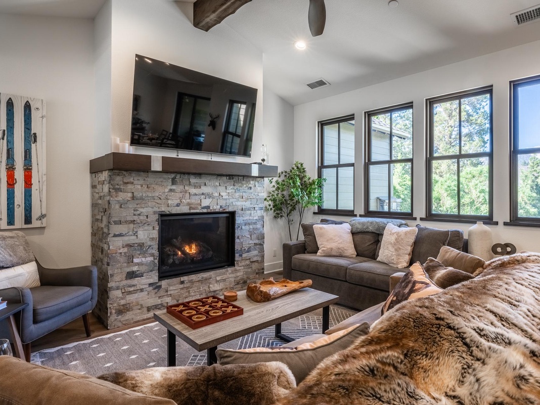 Experience ultimate comfort on the first floor of this stunning 2-story townhome. Step into the beautifully designed bunk room, complete with a queen-over-king bed and a TV for entertainment. Another equally inviting guest bedroom awaits, featuring a full bed, TV, and access to a covered balcony adorned with elegant stonework. Relax in style in the charming seating area while taking in the breathtaking mountain views. There’s a laundry room to keep clothes and ski gear fresh.