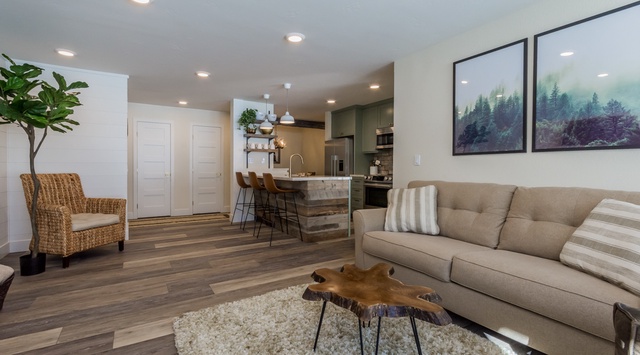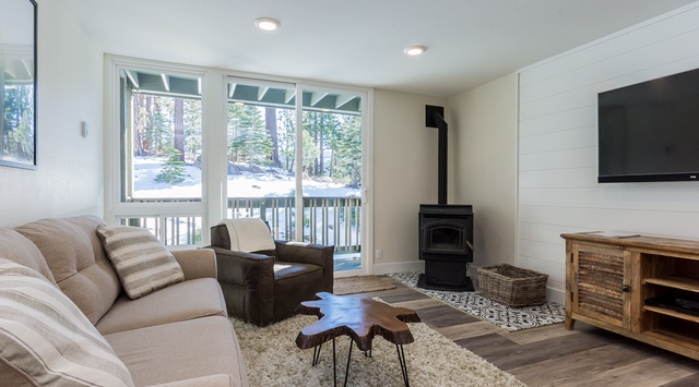 Inside this lovely single-story condo, guests will find a modern retreat dotted with contemporary alpine accents. Hooks and an open closet offer storage for gear in the entryway. Continue inside to the dining area with a table for 6 set beneath a rustic beamed ceiling and antler chandelier. The seamlessly connected kitchen is fully equipped with high-end appliances and an expansive breakfast bar for 3, where guests can savor après-ski drinks while prepping dinner. A few feet away is the open living space with a fashionable live-edge coffee table surrounded by a sofa, armchair, and Smart TV. Step onto the covered deck to enjoy picturesque nature views in the pine-scented air—there’s plenty of room for a yoga routine. When evening falls, the 2 inviting bedrooms offer rest and relaxation. The primary bedroom has a soft king bed and a private bathroom, while the guest bedroom hosts a queen bed and a twin trundle. For extra sleeping accommodations, the living space has a queen sleeper sofa.
