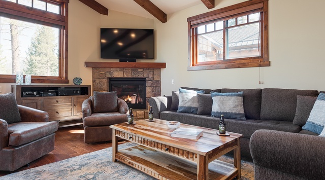 Venture upstairs to find the combined living, dining, and kitchen areas adorned with dark wood floors, trim, and beams for a charming mountain aesthetic. The bright kitchen features KitchenAid appliances, a wine cooler, and a Crock Pot—perfect for effortless homemade meals. There’s room for 6 to dine at the table, with 2 additional seats at the breakfast bar. In the living space, gather on the ample soft seating as the fireplace glows for a quiet, relaxing night. The Smart TV, soundbar, and DVD player offer easy entertainment. When the mountain air calls, step outside to enjoy a drink on the deck or a starlit soak in the hot tub. At bedtime, retire to the primary bedroom with a king bed, private bathroom, and gas fireplace.