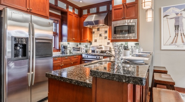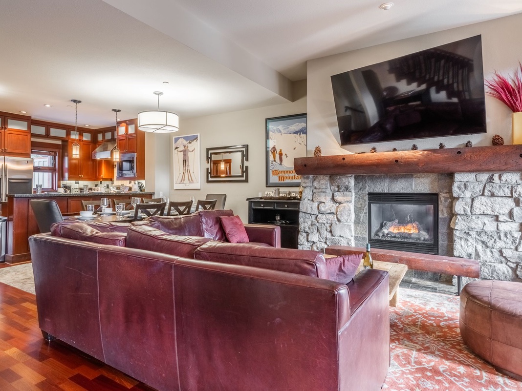 Cherry-hued wood floors, floor-to-ceiling windows, and a stone fireplace combine to create a warm, inviting environment inside this mountain retreat’s main-floor great room. The kitchen features GE appliances and a breakfast bar for 3 that overlooks the dining and living spaces—perfect for keeping the conversation flowing. Recharge after a day on the slopes with a homemade meal at the table for 8 before defrosting in front of the fireplace. A roomy sectional sofa and 2 armchairs offer soft seating for watching the Smart TV or enjoying the tranquil atmosphere. On the balcony, guests can grill or relax while savoring views of the majestic mountains.