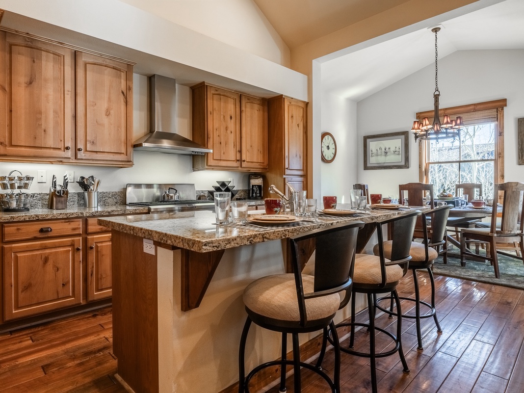 Upon arrival, guests enter this Winter haven into the mud room landing in between the first and second floors. Up the stairs to the second floor is the main level of the home. Wood accents and flooring create a rustic, cozy atmosphere throughout the connected living, dining, and kitchen areas. The soft and spacious sectional beckons guests with the perfect spot for a peaceful night at home, staying warm by the wood-burning fireplace while watching the 65” Smart TV. The kitchen is outfitted with high-end appliances, wood cabinetry, stone countertops, and seating for 3 at the breakfast bar. After a day on the slopes, whip up a delicious dinner and refuel at the 8-person dining table. Or follow the French doors onto the back deck and discover the spectacular mountain views. A primary bedroom with a king bed and private bathroom.