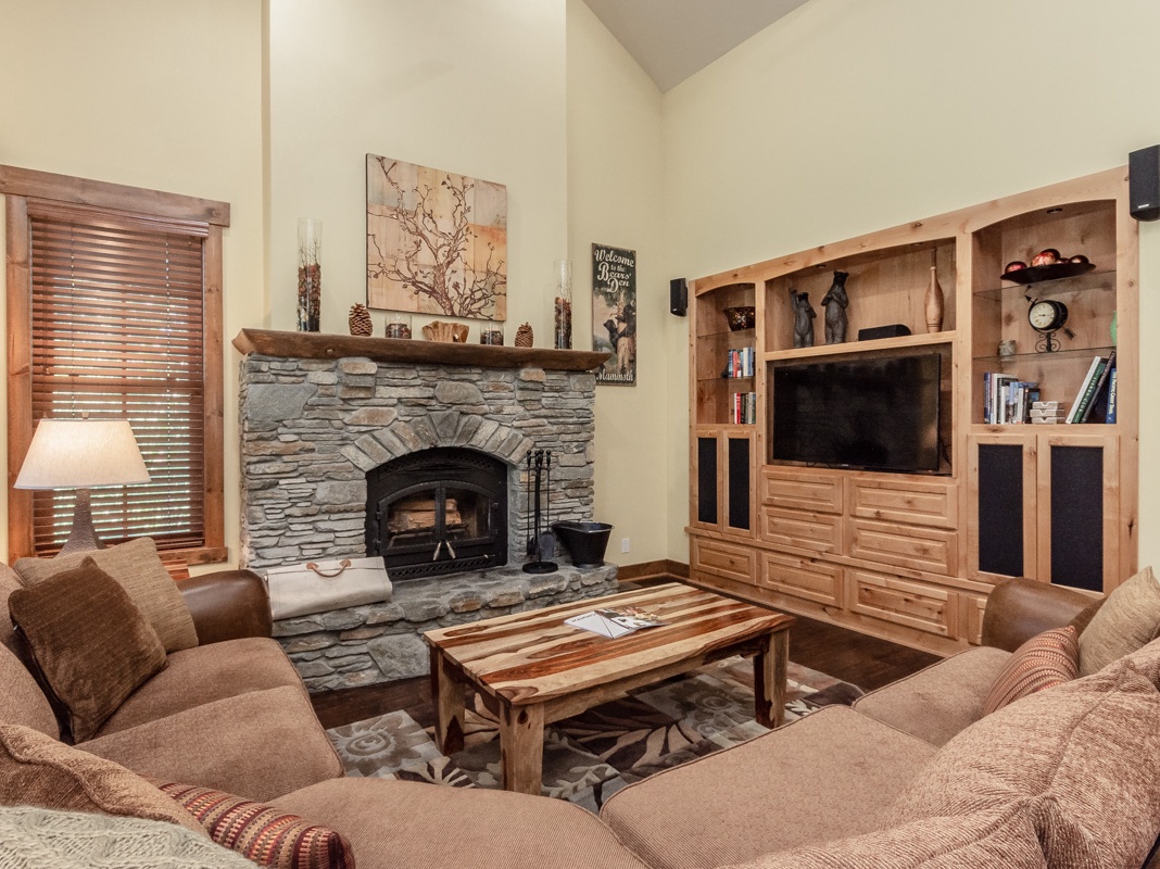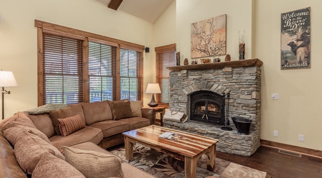 On the main floor, a spacious, 2-story great room welcomes guests with modern mountain decor, hardwood floors, and a stacked stone fireplace. Get cozy on the roomy sectional to warm up after a day on the mountain, or take advantage of the TV for relaxing entertainment. The kitchen inspires guests of all culinary levels with high-end appliances, beautiful countertops, and a 3-seat breakfast bar overlooking the living area. The deck is accessed through the dining area, where a formal wood table seats 8 for sit-down meals. Step outside to enjoy the fresh air at the table for 4. The primary bedroom is on this level and boasts a king bed, picture windows, and a private bathroom.