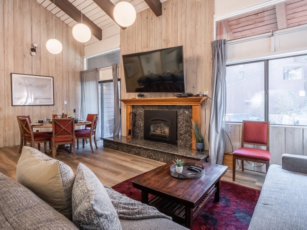 Tall, vaulted ceilings and exposed wood beams add character to the main floor of this modern mountain getaway. The fully equipped kitchen seamlessly flows into the spacious open-concept living and dining areas via a 4-stool breakfast bar. After a day of excitement and exploration, gather for après-ski drinks and tuck into homemade meals at the round 8-person table. A few steps away, sliding glass doors let out to a balcony with a 2-person bistro set and views of the evergreen-dotted landscape. In the living area, a comfortable couch with a chaise sits beside the fireplace and 75” TV, inviting laid-back evenings staying warm by the fire with friends and family. When bedtime arrives, guests can choose between the guest bedroom on this floor with a king bed or head upstairs.