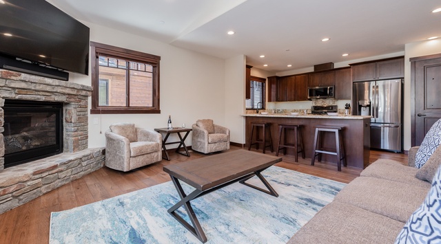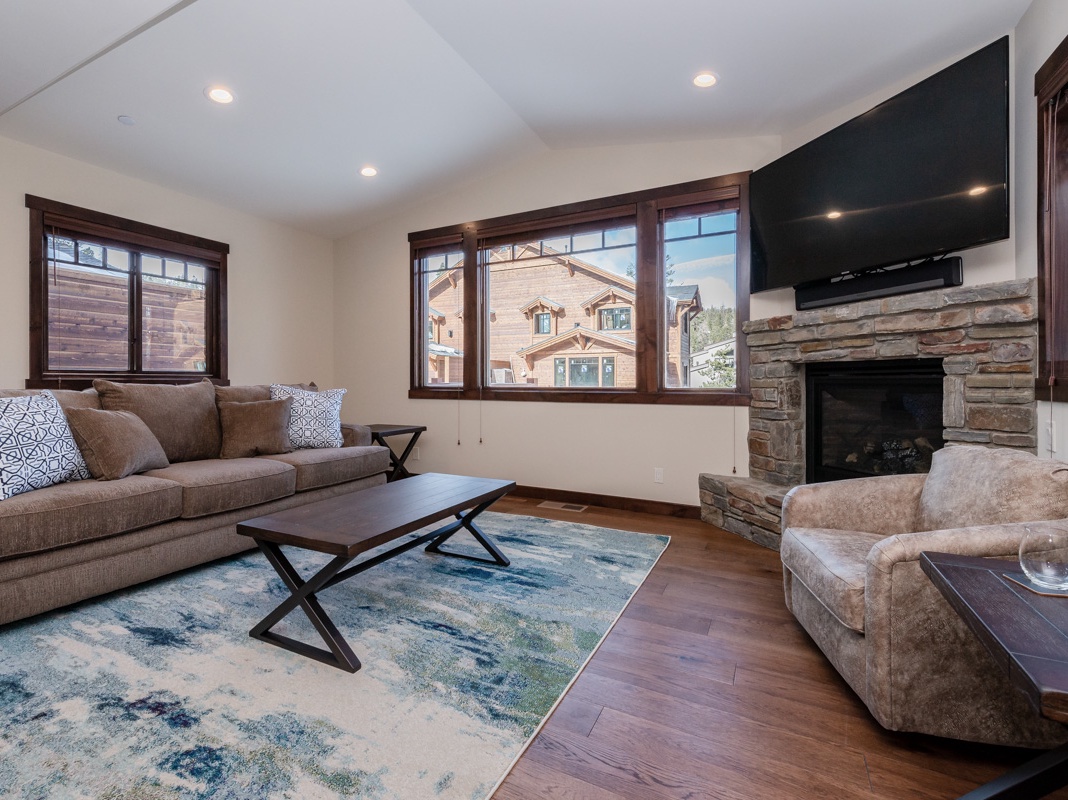 The top-floor primary bedroom is perfect for a little privacy, boasting a king bed, gas fireplace, Smart TV, and private bathroom. There is also a guest bedroom with a king bed and a private bathroom. A washer and dryer are in the hall closet keeps athleticwear ready for the next adventure.