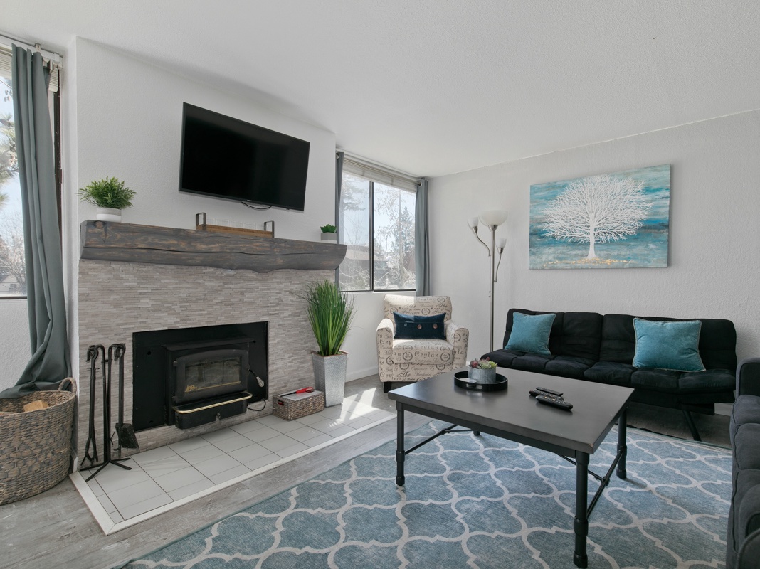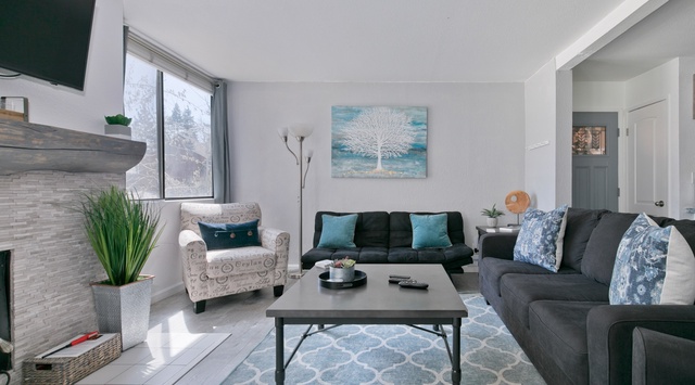 Step inside this lovely ground-level condo to find the seamlessly combined living, kitchen, and dining spaces, adorned with chic, modern decor. Relax in the living area—the sofa, club chair, and loveseat offer plenty of seating to watch TV or savor the toasty warmth of the fireplace. The fully equipped kitchen features high-end appliances and ample counter space for preparing home-cooked meals to fuel days of adventure. Enjoy mornings sipping coffee or tea at the 2-seat breakfast bar, or gather at the dining table for 4 to savor a formal meal. In warmer months, the balcony beckons guests outside to enjoy the alpine air. A guest bedroom with a soft queen bed and TV provides a peaceful retreat when it’s time to wind down for the night.
