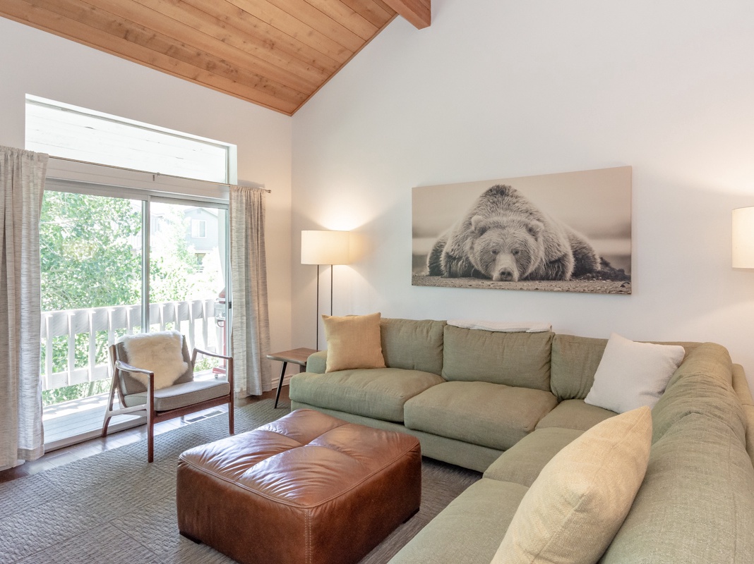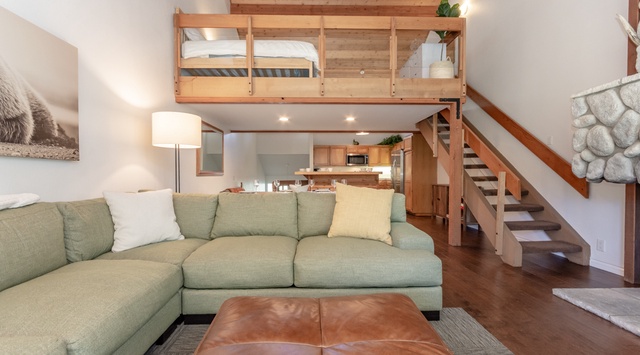 Venture upstairs to discover the main living areas, decorated in soft natural colors and aesthetic wildlife artwork. An impressive, floor-to-ceiling stone fireplace and a vaulted tongue-and-groove ceiling add classic mountain charm to the space. Natural light from clerestory windows fills the kitchen, which is fully equipped with everything needed for home-cooked meals and ample cabinet space for stocking snacks. There’s room for 6 to dine at the mid-century modern-inspired table, with extra seating at the 6-stool breakfast bar. When it’s time to relax, the living area invites guests to pile onto the comfortable green sectional facing the fireplace and stream movies on the Smart TV. Sliding glass doors lead out to the balcony, where guests can enjoy nature views and barbecue on the propane grill.
