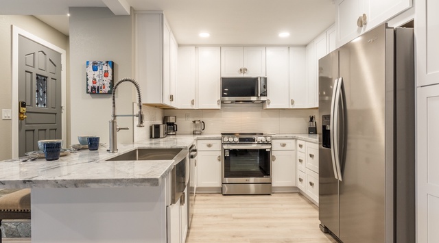Step inside this single-story retreat to find an open great room designed for intimate gatherings. Shades of gray create a soothing atmosphere, while large windows frame the nature view and let in beams of golden sunlight to warm the space. In the living area, a comfy sofa with a chaise lounge and 2 upholstered accent chairs offer seating around the TV and fireplace for cozy movie nights. Wander into the seamlessly connected kitchen to pop a bag of buttery popcorn or make hot chocolate on the stove—high-end appliances and a 2-seat breakfast bar make crafting meals easy while chatting with loved ones. Behind the living space, a dining table for 6 has plenty of space for formal dinners, board games, or puzzles. Wind down the evening with a nightcap on the deck, located out the sliding glass doors. A laundry closet off the kitchen keeps gear ready for tomorrow’s adventures. When it’s time to retire, choose between the comfortable primary bedroom with a private bathroom and the guest bedroom featuring a queen bed. For additional sleeping accommodations, the living space features a sleeper sofa.