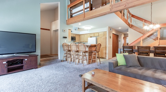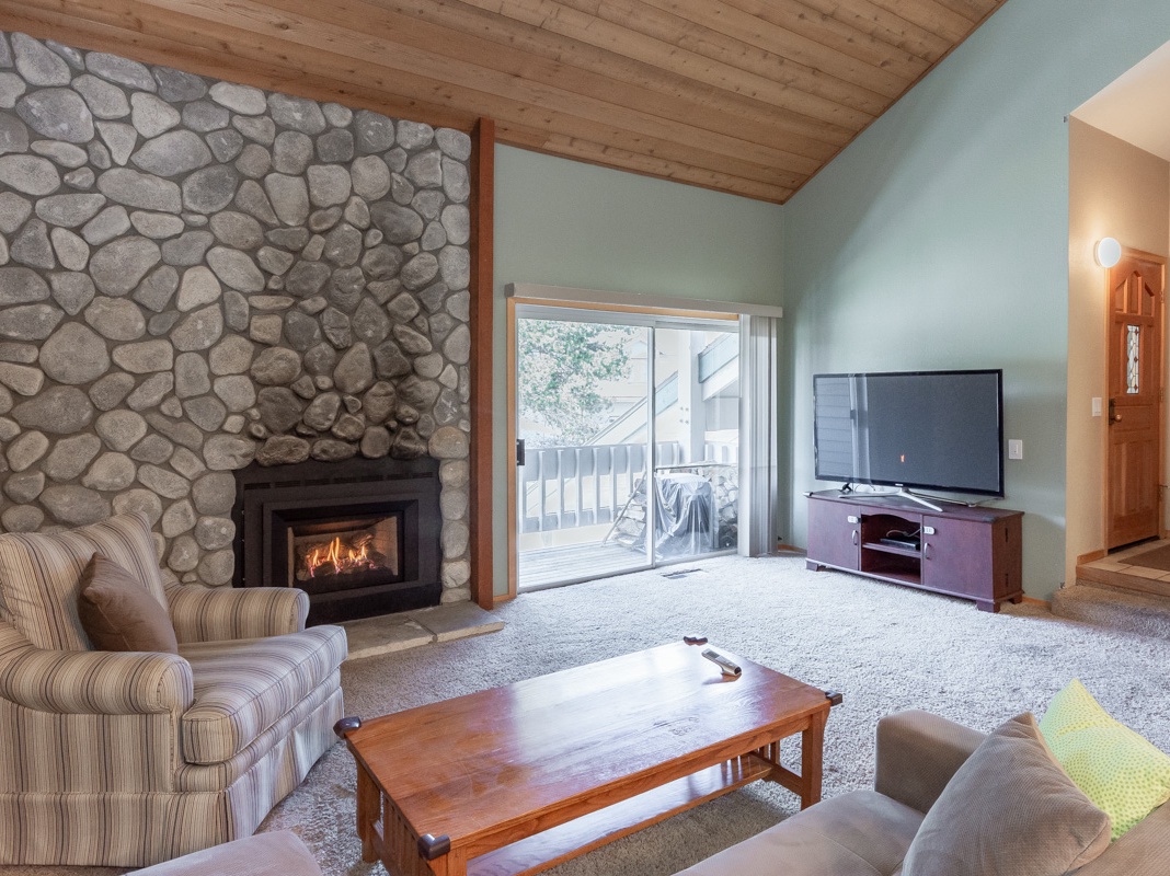 This lovely condo opens into an inviting, 2-story living area with hardwood beams, plush carpet, and a charming fireplace set against a beautiful river rock wall. A comfortable modern sofa and armchair invite gatherings by the flickering fire, while the TV and DVD player are perfect for nights of popcorn and movies. Behind the sofa, a hardwood table comfortably seats up to 8 guests, with additional seating for 4 at the kitchen breakfast bar. An open floor plan creates a seamless flow between the living space, dining area, and fully equipped kitchen. For barbecue lovers, there is a grill on the balcony off the living space. Continue past the convenient washer and dryer to find the primary bedroom with a king bed, private bathroom, and Smart TV, alongside a guest bedroom with a queen bed.