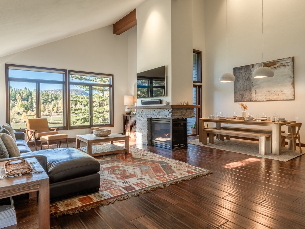 On the second floor, natural light streams through the large windows, highlighting the vaulted ceiling and dark wood floors. A comfortable L-shaped sofa and cozy double-sided gas fireplace encourage relaxing nights. For entertainment, there is a 65” Smart TV with Sonos sound. On the other side of the fireplace sits an 8-person dining table. The high-end kitchen is fully equipped with Bosch appliances and a coffeemaker. Start the day with a morning brew and a delicious brunch at the booth-style breakfast nook for 4. Barbecue lovers, find the grill on the back deck overlooking Mammoth Mountain and Snowcreek Golf Course! A second primary bedroom with a queen bed and private bathroom is on this floor, as well as another bunk room with 2 twin-over-twin beds.