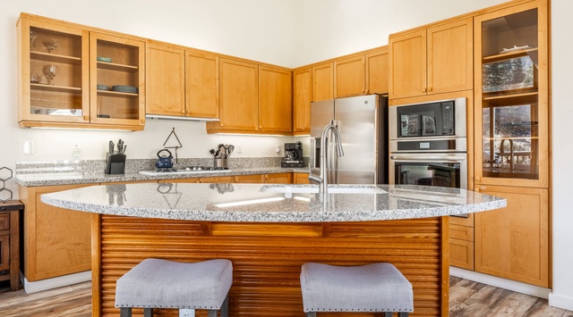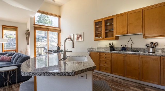 Ascend the hardwood staircase to the second level, where the connected kitchen, living, and dining spaces reside beneath a soaring vaulted ceiling. Large, wood-trimmed picture windows frame the mountainous landscape and fill the room with light. In the living space, a fireplace with a log mantel and a river rock façade curates a warm, alpine atmosphere. After a day of exploring, the wraparound couch, stylish accent chair, TV, and Blu-ray player encourage guests to kick back for a quiet evening with friends and family. The fully equipped kitchen’s high-end appliances and spacious island, which doubles as a breakfast bar for 2, make it easy to craft meals and snacks. For formal meals, a country-style dining table is to the side. Sliding glass doors lead to a patio with lounge seating and a grill for enjoying blue-bird days and Summer evenings. At the end of the night, guests can retire to the primary bedroom with a king bed, TV, and private bathroom on this level.