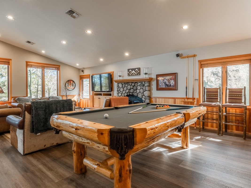 The great room awaits on the top level. Social chefs will love the kitchen's high-end appliances, open layout, and spacious breakfast bar for 4. Pop open a bottle of wine to share over a delicious dinner at the 8-seat formal dining table, nestled underneath a lodge-style chandelier. The wood-burning fireplace, 2 supple leather loveseats, 2 matching armchairs, and a large coffee table for drinks and snacks are the perfect setting for cozy movie nights. For indoor fun and some friendly competition, there's a pool table to the side. Sliding glass doors lead onto the balcony, outfitted with a gas grill and chairs for appreciating the stunning scenery or stargazing. At night's end, guests can retire to the primary bedroom with a king bed, couch, Smart TV, and desk located past the kitchen.