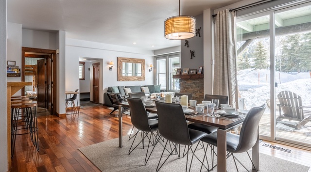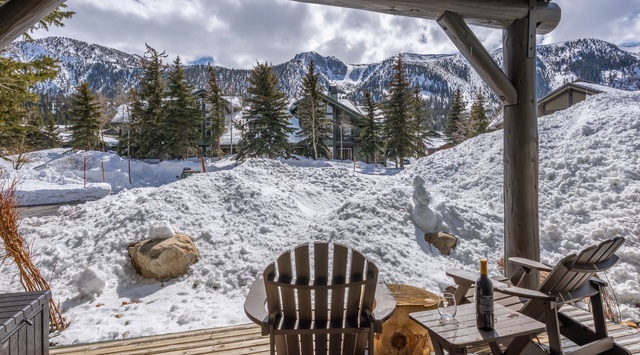 This stunning ground-floor condo makes guests feel right at home, thanks to the thoughtful layout that puts all the rooms on one floor. Slate entry and hardwood floors add a touch of elegance to the already spacious great room. The living room greets guests with plush furnishings, a cozy stacked stone fireplace, and a large TV, perfect for a night of relaxation. A traditional dining area comfortably seats 6, so everyone can enjoy a delicious meal together. The kitchen is a chef's dream, fully equipped with everything you need to whip up a mouthwatering home-cooked meal including an induction range stove. No need to worry about laundry either, as this retreat comes with its own washer and dryer. With 2 bedrooms on opposite sides of the open floor plan, it's perfect for 2 couples or parents seeking a quiet haven away from the kids. One bedroom features a Eastern King bed, while the other has an XL twin-over-queen bunk bed. Step out onto the deck for panoramic views of the surrounding Sherwin Mountains, along with a grassy area right off the deck, perfect for enjoying the outdoors.