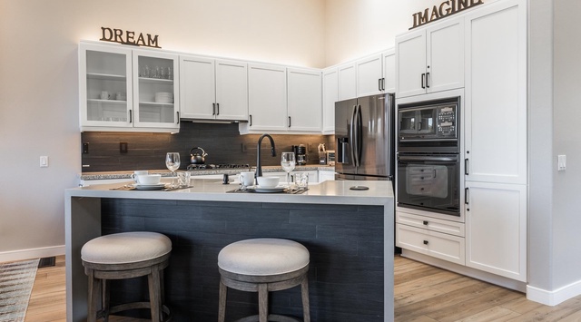 The heart of this completely renovated home is located on the second floor. A beautiful wall of windows floods the great room with natural light, highlighting the beauty of the surrounding landscape. A plush living area, with a 65" TV and SONOS speakers, is excellent for watching movies, while the remote-controlled fireplace creates a warm and inviting atmosphere. Boasting high-end appliances, pristine white cabinetry, and granite countertops, this open kitchen is a chef's dream. Prep meals on the sizeable kitchen island with a built-in sink that doubles as a quaint breakfast bar for 2. The bright dining area offers ample space to entertain up to 6 guests around a traditional table. Access the spacious outdoor deck from here to admire the spectacular alpine views. Guests can retire to the secondary primary bedroom on this floor with a California king-sized Sleep Number Smart Bed, 55" TV, and a private bathroom.