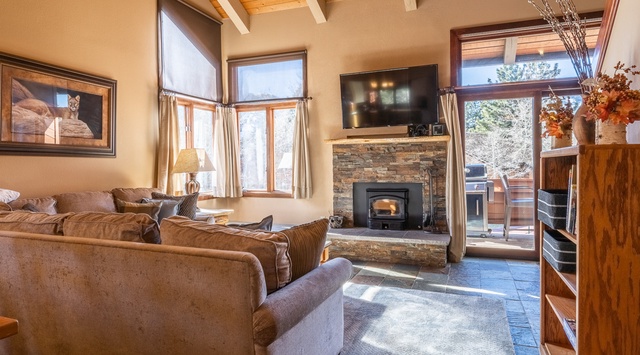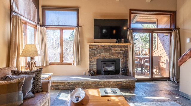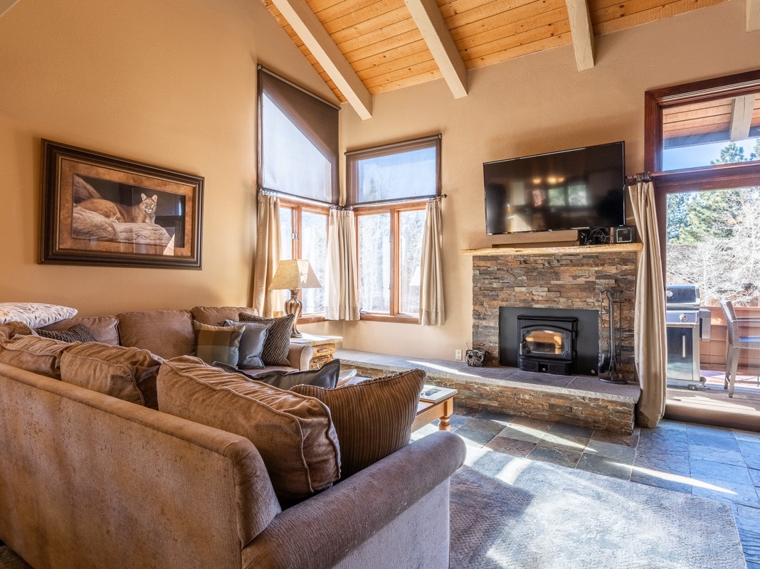 Vaulted ceilings, stone floors, and a cozy wood-burning fireplace set the tone for a classic alpine lodge atmosphere in the first-floor great room of this stunning corner unit. Framed by breathtaking mountain views, the open and inviting living area is perfect for sinking into the plush sectional couch and enjoying a bit of leisurely fun with the 55” TV. Below large picture windows, a snug nook beckons guests to settle in with a good book or simply bask in the sunshine. Perfect for gatherings, the traditional dining area provides seating for 6, ideal for shared meals and exciting family game nights. Adjacent to it, the fully equipped kitchen features high-end appliances, spacious countertops, and a convenient breakfast bar with seating for 2. On bright bluebird days, the private deck off the living area transforms into a tranquil haven, complete with a propane grill. When it's time to retire, the first floor boasts an inviting primary bedroom with a plush king bed, TV, and shared bathroom.