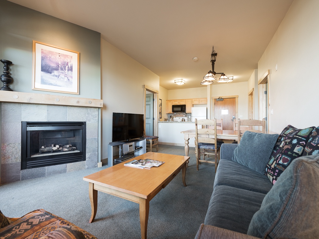 Take the elevator to the top level, where an inviting open floor plan effortlessly blends the kitchen, dining, and living areas into a relaxing mountain retreat. To the right, the chef’s kitchen stands out with high-end appliances, sleek countertops, and ample cabinet storage. Whether enjoying a quick bite or sit-down meal, the wood dining table comfortably seats 6 for intimate gatherings. Enhanced by plush furnishings, earthy tones, and breathtaking views of the Sherwin Mountains, the vibrant living area combines serenity with alpine charm. Savor the beauty of Winter’s snowy splendor through a spacious picture window, or step onto the private balcony to soak in the serenity of sunny bluebird days. Unwind on the plush sectional that transforms into a queen sleeper sofa, cozy up by the glow of the gas fireplace in the inviting armchair, or gather for an immersive family movie night on the 46” TV with a soundbar. Two spacious bedrooms are nestled on either side of the great room, offering the perfect balance of comfort and privacy—a lovely guest bedroom with 2 twin beds and TV, as well as a spacious primary with a king pillowtop bed, TV, and private bathroom.