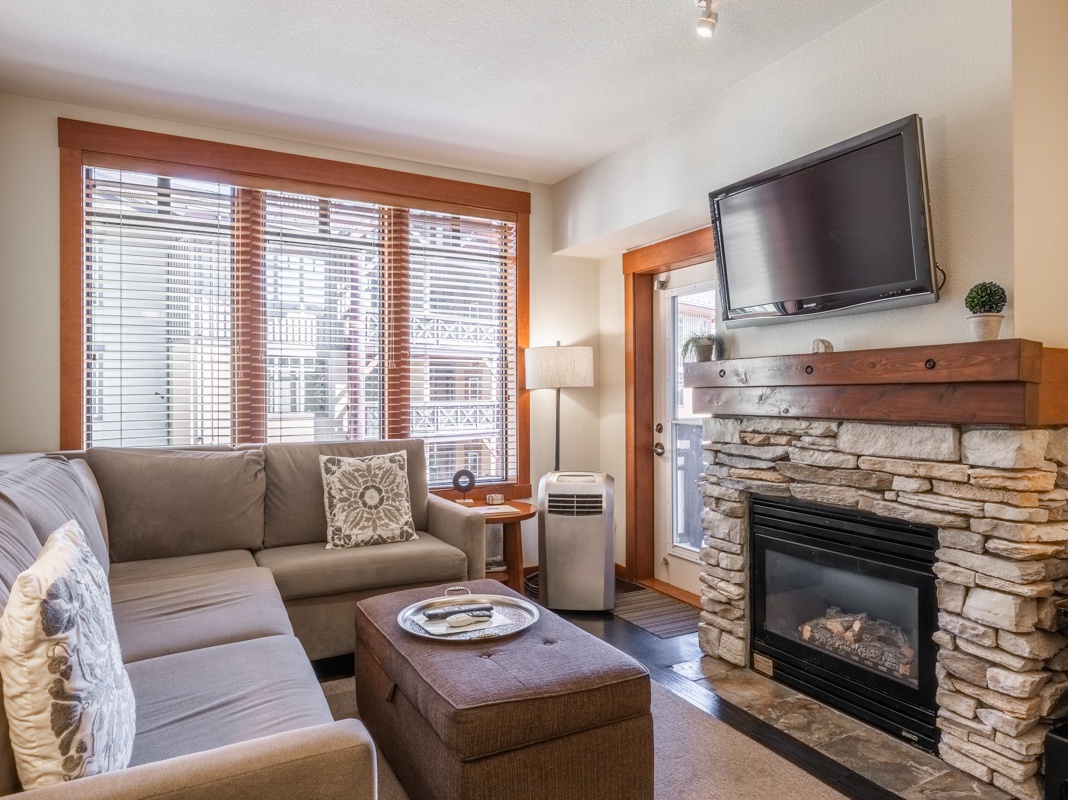 Expansive picture windows frame breathtaking panoramic mountain views, flooding the great room with natural light and creating an inviting ambiance. The living area is a true haven of comfort, featuring a 37” wall-mounted TV and a stacked stone fireplace, perfect for cozy evenings after a day on the slopes. A plush sectional couch, ottoman, and chair provide ample seating for everyone to unwind and relax during movie nights or quiet moments. The chef’s kitchen is designed with both form and function, equipped with sleek appliances—including a stove, refrigerator, microwave, and dishwasher—for effortless meal prep and cleanup. An adjacent dining area offers seating for 4, providing an ideal space for enjoying meals together after exploring. When it’s time to rest, retreat to the generously sized primary bedroom, which boasts a luxurious king pillowtop bed and stunning mountain vistas, promising a peaceful night’s sleep. The shared bathroom features a refreshing shower/tub combination for added convenience. Step out onto the covered deck to experience the magical alpenglow as the sun rises or sets, offering a serene moment of connection with nature.