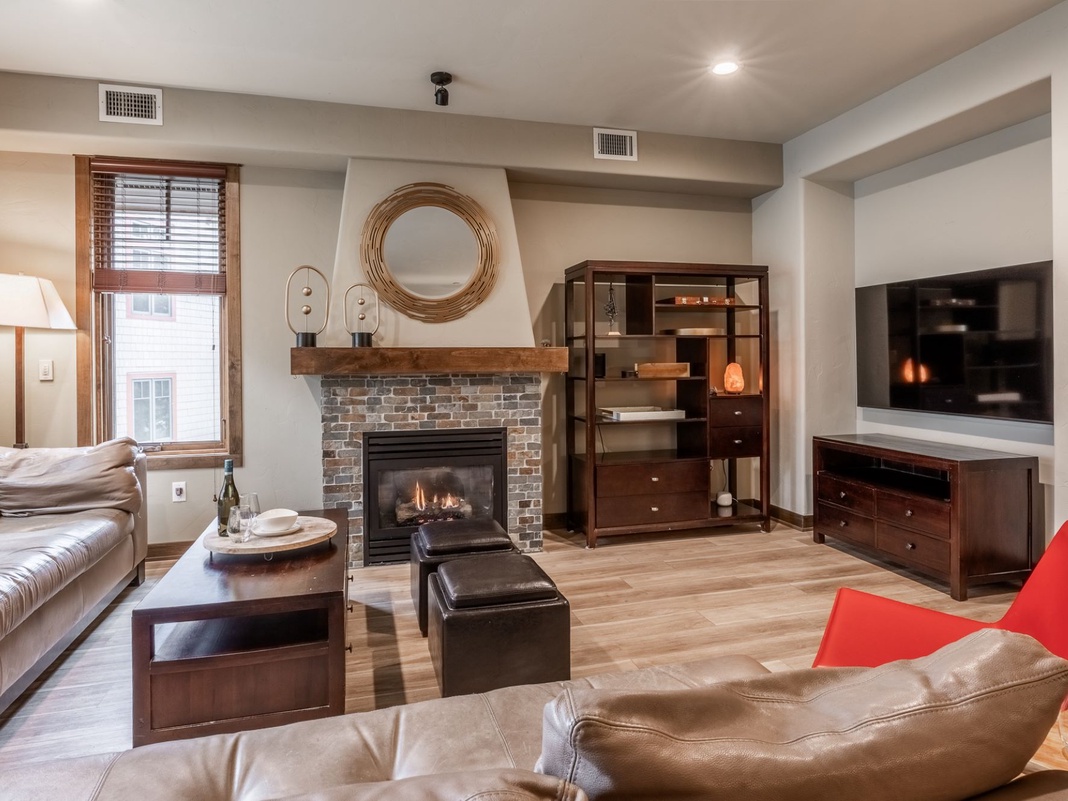 Discover the heart of this townhome on the second floor, where a spacious and well-lit great room seamlessly blends the living, dining, and kitchen areas. An inviting living area welcomes guests inside to a plush sectional couch, gas fireplace, TV, and large picture windows that frame the stunning outside views. The fully equipped kitchen boasts high-end appliances and ample counter space. A quaint 4-stool breakfast bar provides casual dining, while the traditional dining area comfortably seats 8, but can expand to seat 12 for a sit-down meal. Step out onto the outdoor deck, where friends and family can gather around the 8-person alfresco dining table to unwind—plus, there's a convenient gas grill nearby. When it's time to rest, retreat to the 2 guest bedrooms on this floor, each furnished with a queen-sized bed.