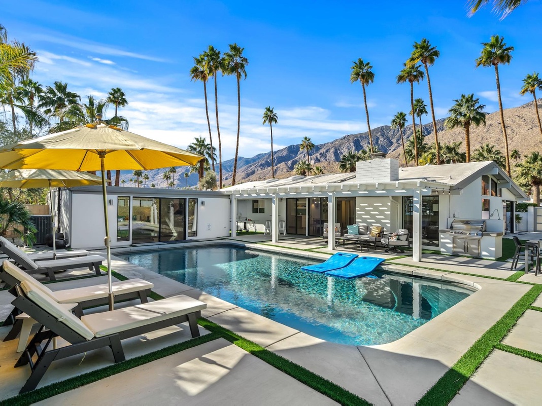 DETAILS: Step into the glamour and elegance of yesteryear at Alexander Desert Dreams, an extraordinary 3-bedroom, 2-bathroom Main House with a charming 1-bedroom, 1 bathroom Casita that sleeps 8—epitomizing Palm Springs luxury and charisma. Designed by architects Palmer and Krisel and crafted by the legendary Alexander Construction Company, this mid-century modern gem is located within the renowned Twin Palms neighborhood, encompassing the revolutionary style that transformed Palm Springs in the late 1950s. With vibrant open interiors and extraordinary outdoor amenities, this mid-century modern abode invites guests to experience ultimate luxury.